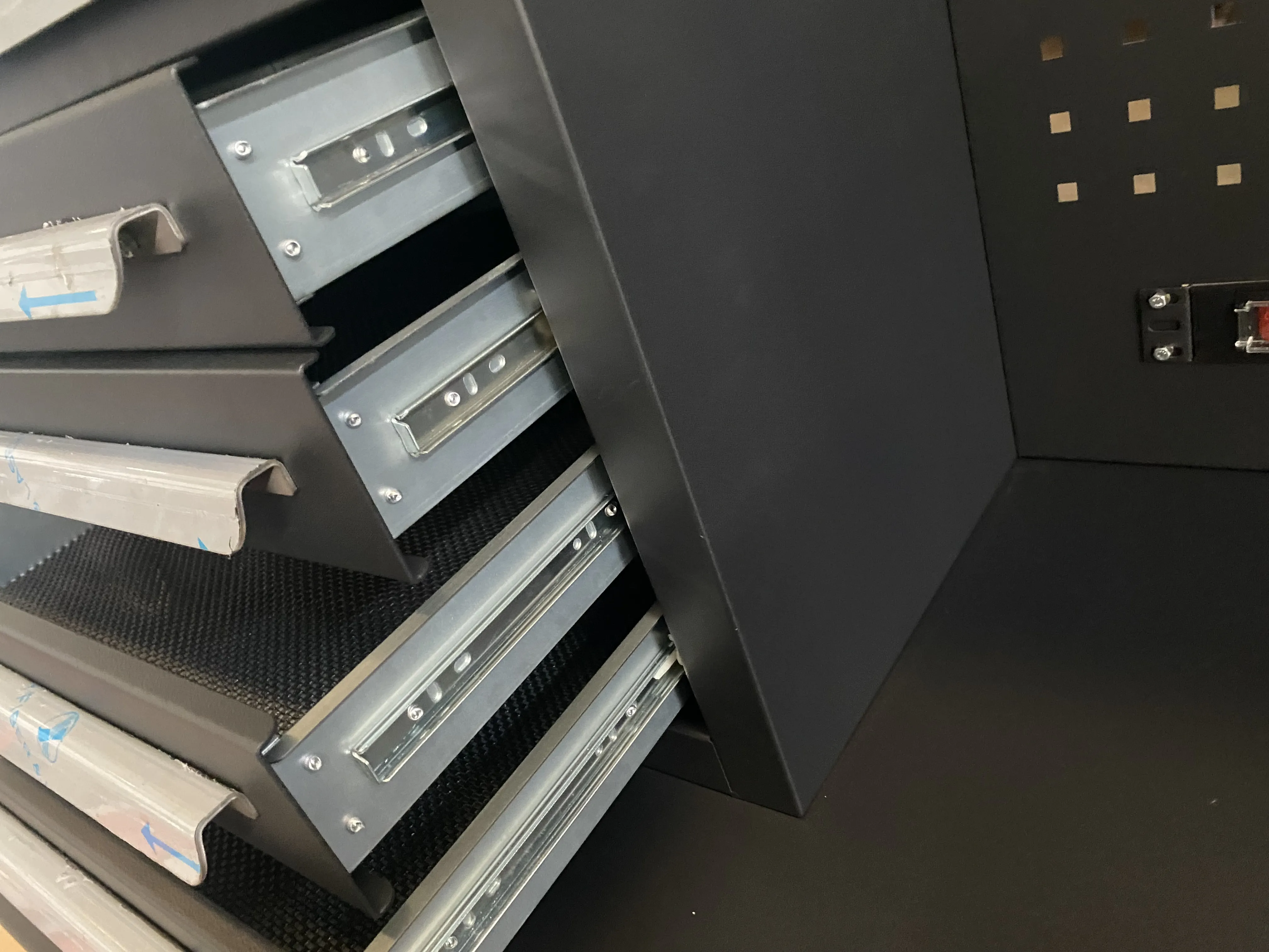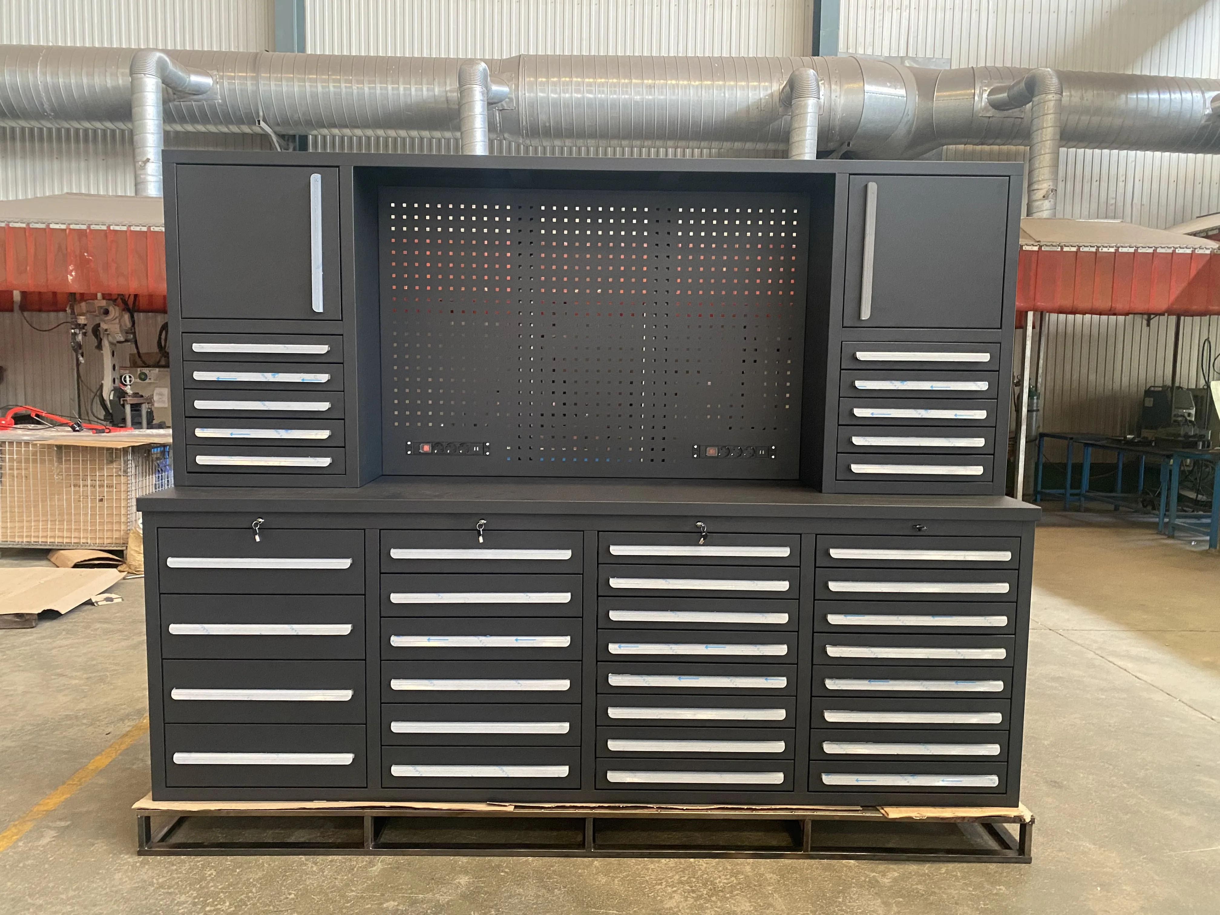 Työkalukaappi on 2550 millimetriä pitkä. Paksuus, väri, koko ja laatikot voidaan räätälöidä asiakkaiden vaatimusten mukaisesti. Sekä Wrokbench että laatikot on valmistettu kylmän rullatuista teräksestä. Täällä on kaksi voimalaista. Laatikot on varustettu LED -valoilla, LED -valot voidaan ripustaa verkkopaneeliin, joka helpottaa valaistusta työskennellessäsi työpöydällä. Laatikossa on tyynyjä, jotka voivat tehokkaasti vähentää naarmuja.